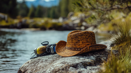 A rustic straw hat rests on a large rock beside a serene river, accompanied by a fishing rod and lure. This image captures the essence of outdoor leisure, evoking feelings of adventure and tranquility in a picturesque natural setting.