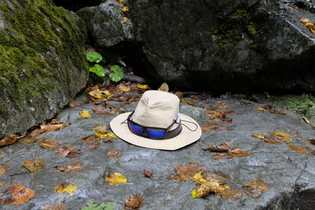 hiking hat with sunglasses on a rock, created with generative ai