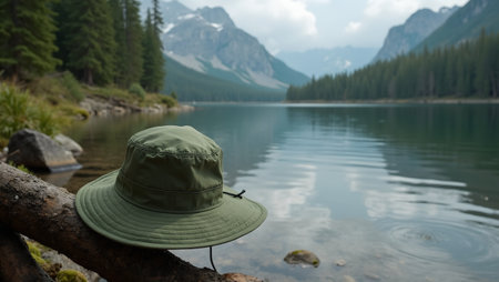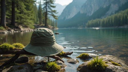 Adventure hat hanging on branch by lake shadow over mossy rocks serene waters reflect nature