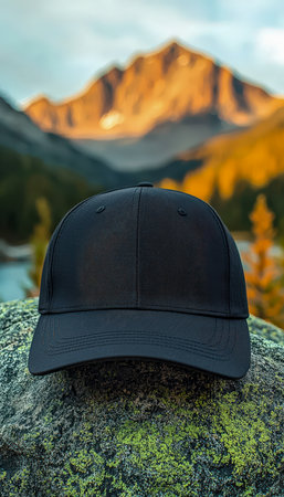 A sleek black cap rests on a lush moss-covered stone, overlooking rugged mountains as a warm sunset bathes the scene in golden light.