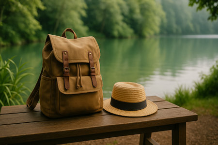 A tan backpack and straw hat sit on a wooden table by a serene lake.
