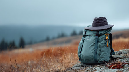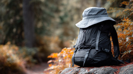 In the woods, a hat, backpack, map, and book rest on a wooden table. The serene scene showcases a blend of nature and manmade items