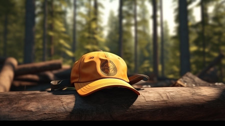 Yellow baseball cap on a wooden table in the forest. 3d rendering