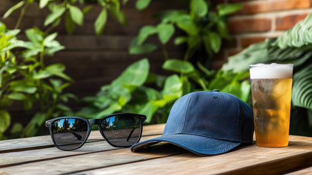 Baseball cap beside a cold drink and sunglasses on a sunny patio table