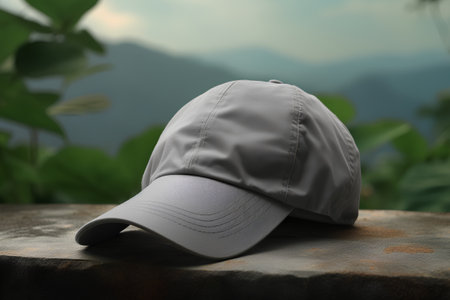 Baseball cap on a rock in the mountains. Selective focus.