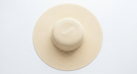Top down view of a light beige wide brim straw hat on a plain white background Clear details and vibrant color...