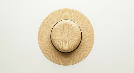 A straw boater hat with a black ribbon band is viewed from directly above on a white background.