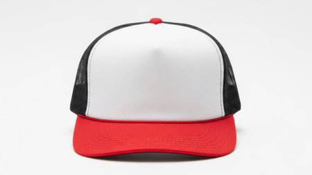 A stylish trucker cap featuring a red brim, white front, and black mesh back with a small red button on top.