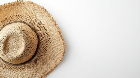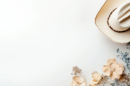 A white rustic neutral background with a straw farmer's hat in soft hues. Ideal for farmhouse, western, and country-inspired designs. Blank space for text or product placement. AI-generated.