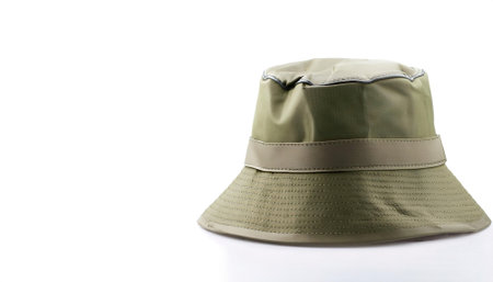 Khaki olive green bucket, fisherman, Irish country or session hat is a hat with a narrow, downward sloping brim made from heavy duty cotton fabric such as denim or canvas. Isolated on white background