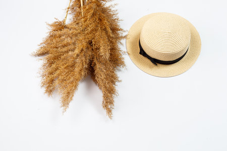 Female summer hat and dry grass on a white background. Summer holidays, vacation, travel, travel concept. Beach accessories top view. Space for text.