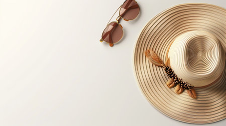 Stylish advertising template with a floating summer hat and sunglasses on one side, with ample space for text on a white background, --ar 16:9 Job ID: f1d03f1c-46e9-496b-8b37-76b11c329b02