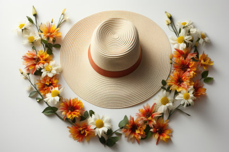 Straw hat with floral decoration hanging on white wooden wall. That the image is generated using AI.
