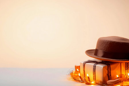 A warm glow emanates from a set of candles next to a stylish hat and beautifully wrapped gifts, enhancing the festive mood during a celebration