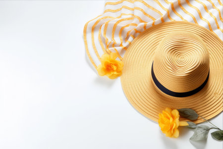 A straw hat and sunglasses are essential accessories for summer. They provide sun protection and add a touch of style to any outfit. Isolated on white background.