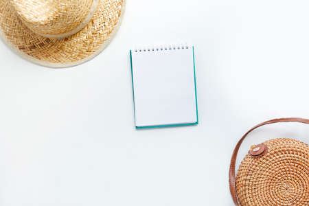 Summer hat, sunglasses, passport and money on a white background. Products for summer holidays. Travel concept. Space for the text. Top view