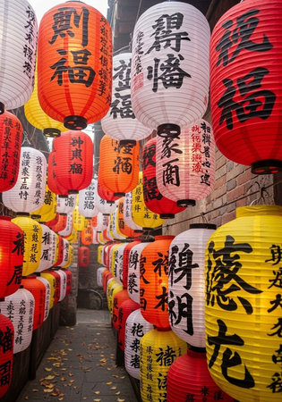 Vibrant red, yellow, and white Chinese lanterns with black calligraphy hanging in a narrow alleyway.