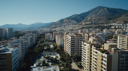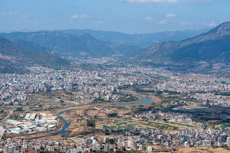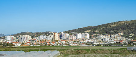 View of a town in rural Albania. Modern buildings and old houses with orange rooftops against mountains background. Travel photo, nobody