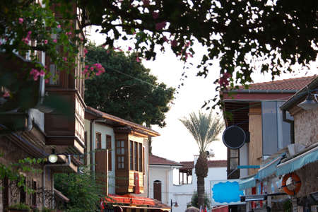 Old buildings and beautiful plants. Street of historical town. Ancient city of Antalya.