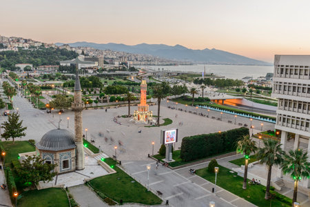 Konak Square street view with old clock tower (Clock Tower) at sunset. It was built in 1901 and accepted as the official symbol of Izmir City, Turkey.
