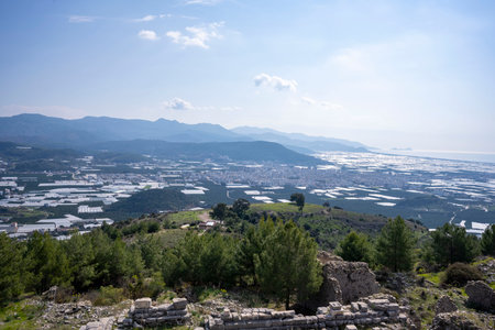 Panarama of Manavgat city, Turkey at sunset. View from the observation deck through the pine trees