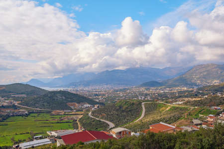 Beautiful Mediterranean landscape. Balkan road trip: clouds, mountains, hills and roads. Montenegro, view of Bar city
