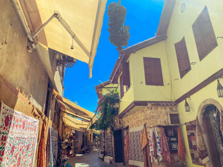 Antalya, Turkey - 2 August 2021: Streets of the old town of Kaleici. Street cafes and shops for tourists. Attractions, rest and travel in Antalya. high quality photo