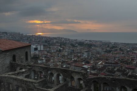 Golden hour landscape and cityscape from Lekuresi Castle, Saranda, Albania with Adriatic Sea coast and residential district view, clear spring sky with evening haze