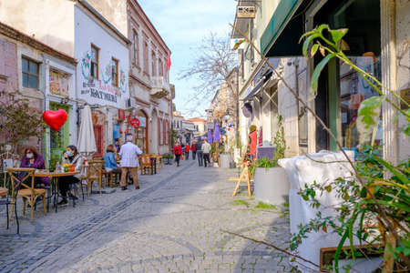 Urla, Izmir, Turkey - 03.08.2021: beautiful local traditional street in a clear air and vendors and people with mask sitting
