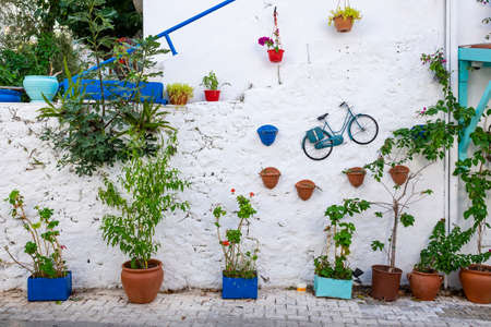 Decorated white wall with plants and bicycle, Kas, Turkey