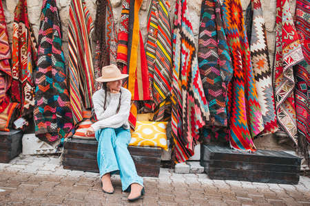 Old traditional Turkish carpet shop in cave house Cappadocia, Turkey Kapadokya. Young woman on vacation in Turkey