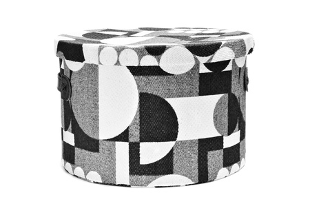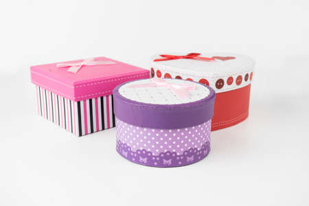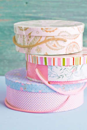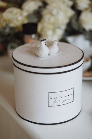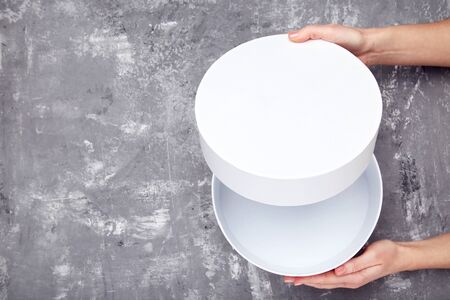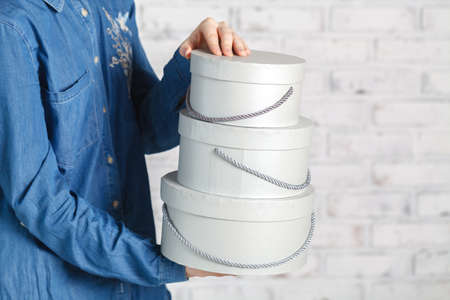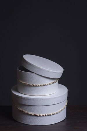 Close up of two white round gift hat boxes on a dark background, selective focus