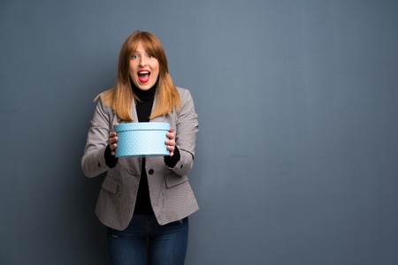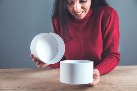 The surprised blonde woman opens a gift box. Concept surprise, holiday, Valentine's Day, March 8, Mother's Day, sale, promotion.