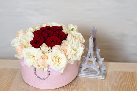gift pink box with beautiful bouquet of blooming red and white roses standing on the wooden table. Symbol of romantic moment and Valentines Day.