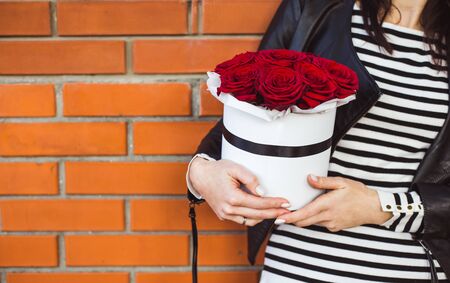 Bouquet of red roses in a box in the hands of the girl. Brick wall background
