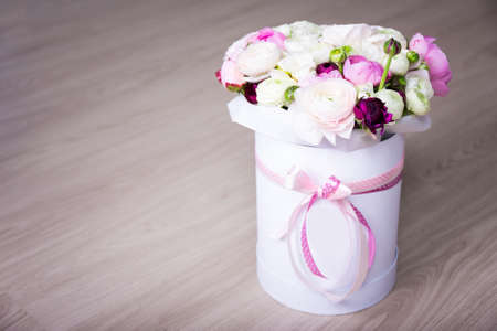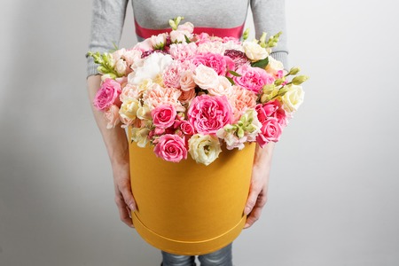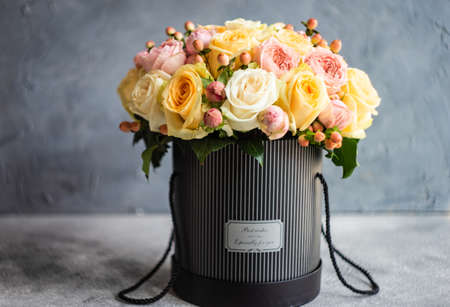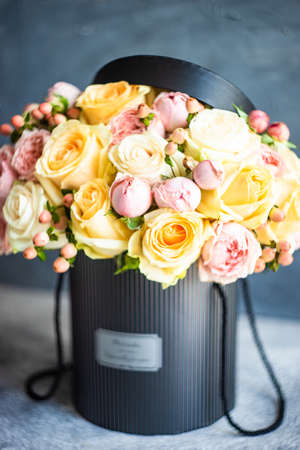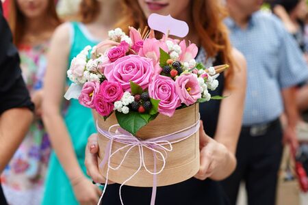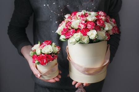 Luxury bouquets of flowers in the hat box. roses in the hands of women.