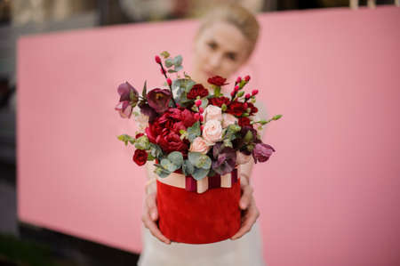 Close-up flower-box in woman hands as a gift concept for wedding, birthday, event, celebration, flowers delivery, surprise