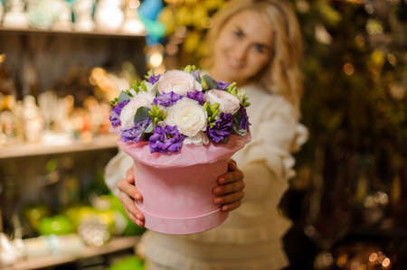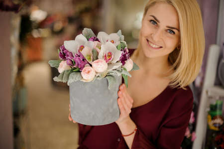 Young blond woman in pink blouse holding a beautiful flower composition in green round box and looks at it.