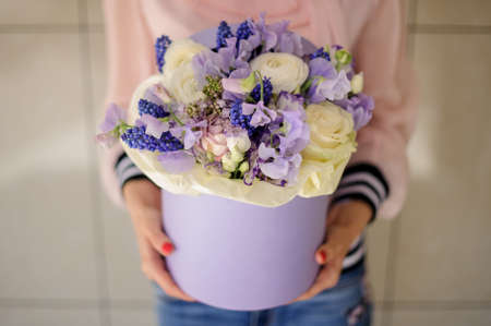 Decorative round box with flowers like white roses, blue muscari and mattiola in womans hands.