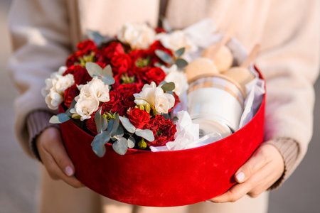 Close-up of a red gift box with a composition of roses along with a candle and macaroons