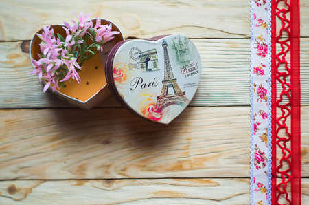 Top view of hands and stylish flower box with cute pink ribbon on the background of wooden floor