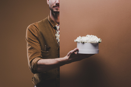 Young man in vintage styled clothes holding box with flowers isolated on brown