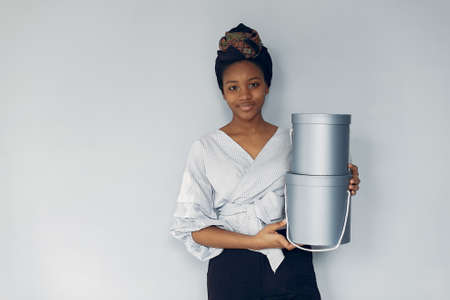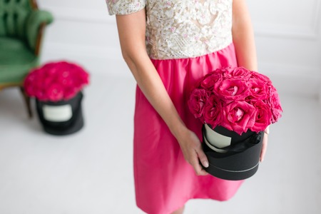 Girl standing and holding black box with pink roses. Fashion style studio portrait. Luxury interior