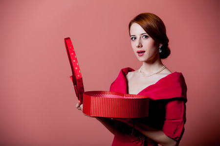 Young redhead woman in red Victorian epoch clothes with heart shape gift on pink background.