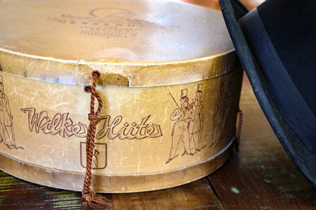 Berlin, Germany - August 25, 2019: A historic hatbox from Berlin in the 19th century with a bowler on an old wooden table.