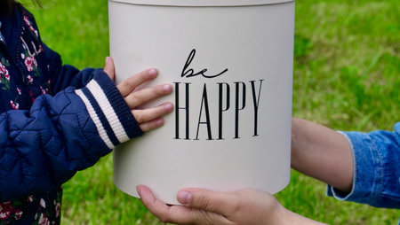 Mom and little daughter holding a gift box with the inscription Be happy close up without a face. Mother with baby outside