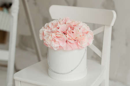 A beautiful bouquet of summer flowers in a round box on a white wall background. Decorative flowers in the interior.
