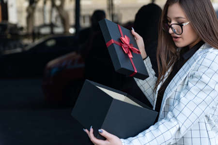 Surprised beautiful woman opened gift box. Happy young woman with gift on the street. Girl received a gift and opened it.