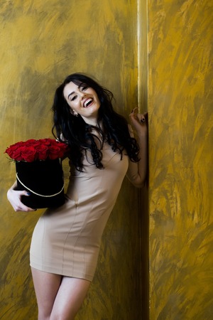 Pretty happy girl or beautiful woman with long brunette hair wearing beige dress smiling with roses, natural flowers, in black box on golden wall background