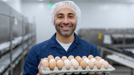 A cheerful worker in a food processing facility proudly poses with a tray of fresh eggs, showcasing commitment to quality and hygiene in food production.